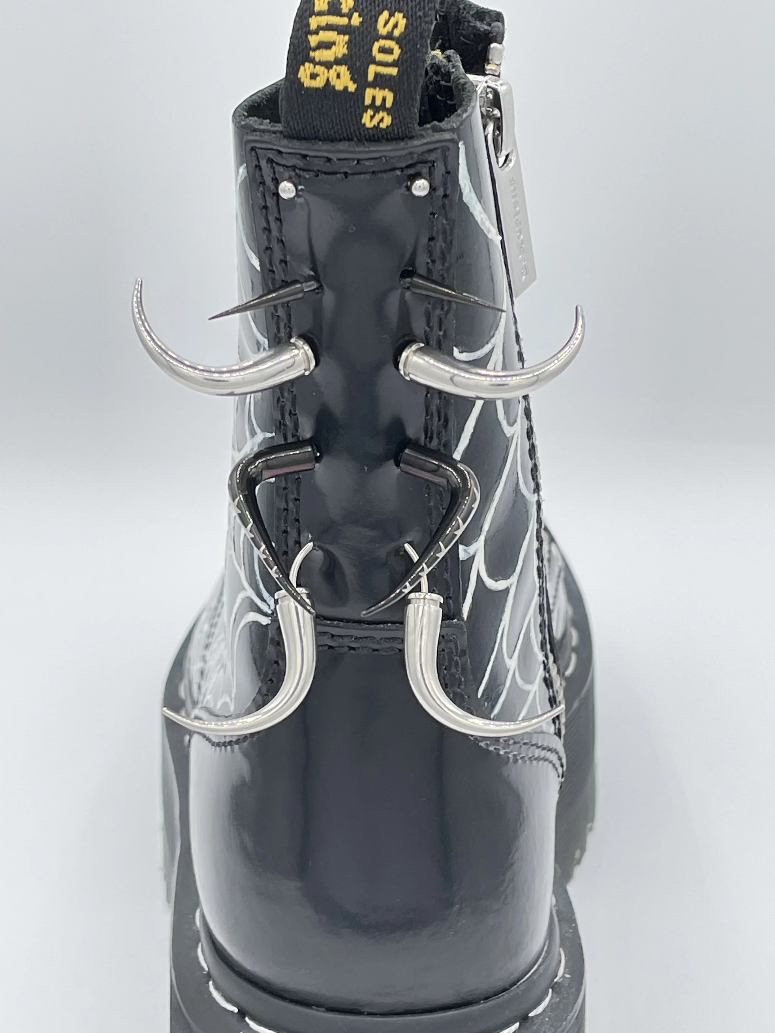 These spider docs were painted as a gift for myself! customizations include silver stitching, piercing hardware, and painting of spiders and webs in metallic/ glow in the dark paint
